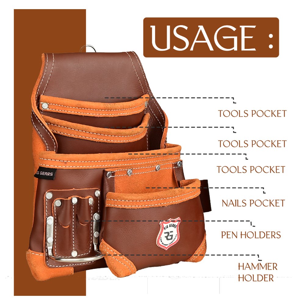 • 3 x tools pocket, 1 x nails pocket, hammer holder + pencil pockets